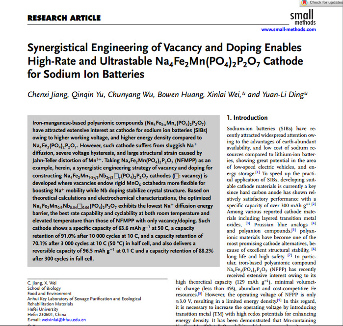 近日,我校生物食品与环境学院2022级资源与环境专业研究生蒋晨熙以第一作者在国际学术期刊《Small Methods》(IF=10.7,中科院二区)发表了题为“Synergistical Engineering of Vacancy and Doping Enables High-Rate and Ultrastable Na4Fe2Mn(PO4)2P2O7 Cathode for Sodium Ion Batteries”的研究论文。我校高级实验师卫新来、湖南大学教授丁元力为通讯作者,日韩欧美福利视频_黑人巨大人精品欧美三区_欧美成人另类人妖_欧美在线精品一区二区三区_欧美一区二区三区性视频_日韩精品欧美视频_性欧美极品xxxx欧美一区二区为第一完成单位。