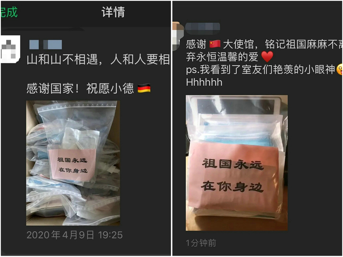 “爱心防疫包”包含N95口罩两只、医用外科口罩两盒共二十只、表面消毒巾一包及《新冠防疫知识问答手册》一份。在德国市场防疫物资相对匮乏的时刻,这份母爱显得尤为珍贵。同学们在网上和朋友圈纷纷晒出图片,表达对祖国温情的感激,对使领馆、在德物资提供企业及学联工作人员奉献爱心辛苦工作的感谢,并衷心祝愿祖国繁荣昌盛,祝福德国早日走出疫情的阴霾!