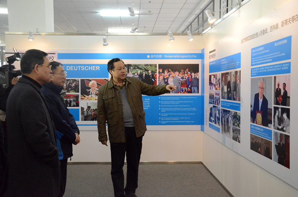 随后,蔡敬民陪同潘亚群一行参观了我校中德共建合肥学院三十周年成果展及体育馆。期间,蔡敬民对学校发展历程、中德合作项目、学生创新创业成果等方面作了详细介绍。