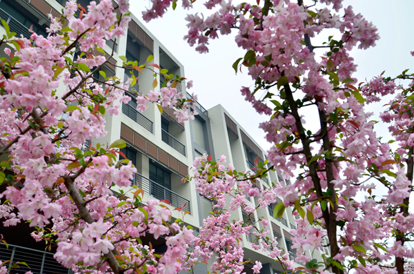 漫步校园,楼层下、宿舍间、绿水影春光。近处茸茸的绿草似乎给大地铺上了一层绒毯,粉红的春花尽情待放,美得那么令人沉醉。三、四月间的合肥学院花香染云鬓,锦瑟思华年;一场春雨过后,校园里柳丝如烟、春意勃发,微风中,翩翩舞动,袅袅婷婷。